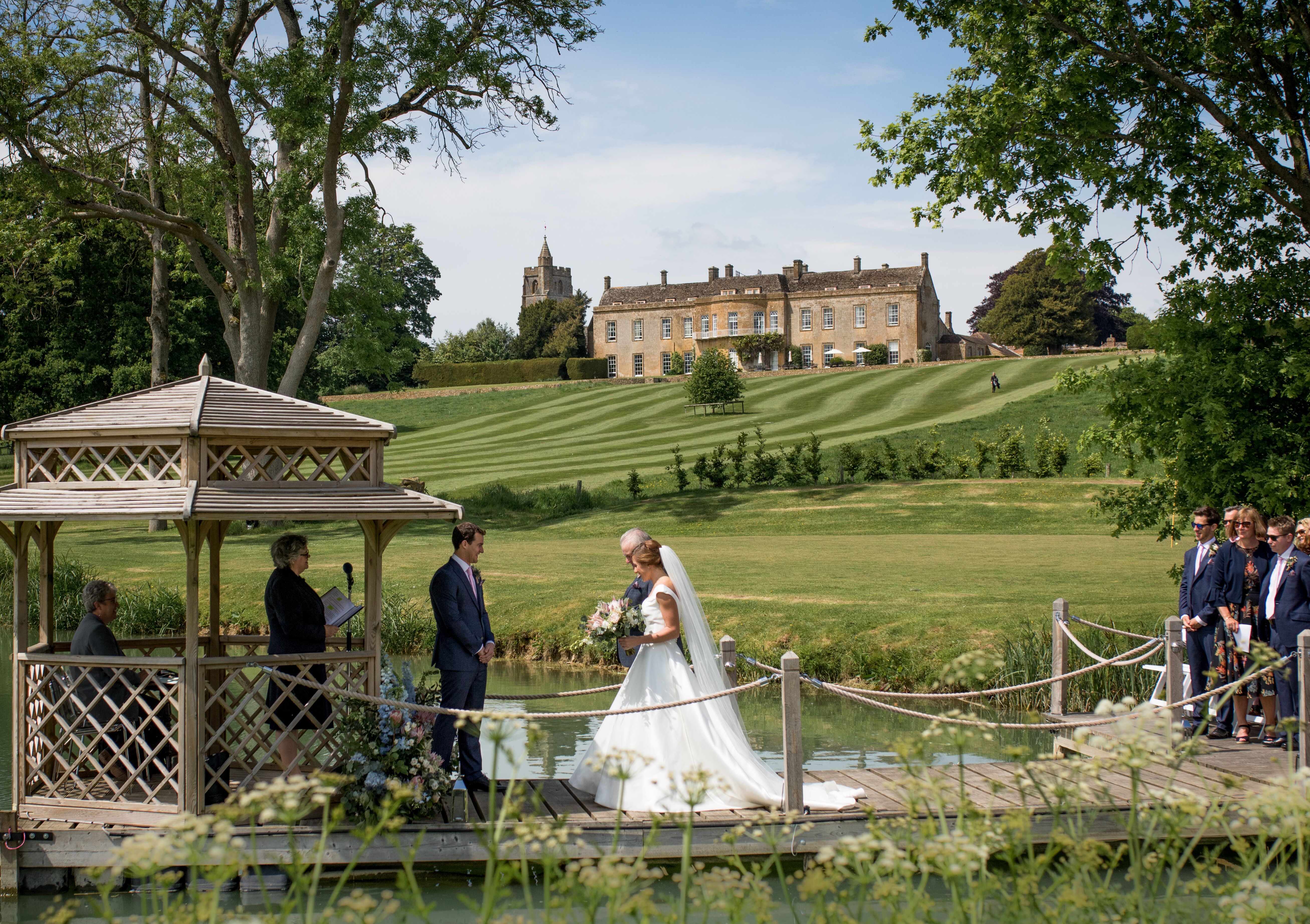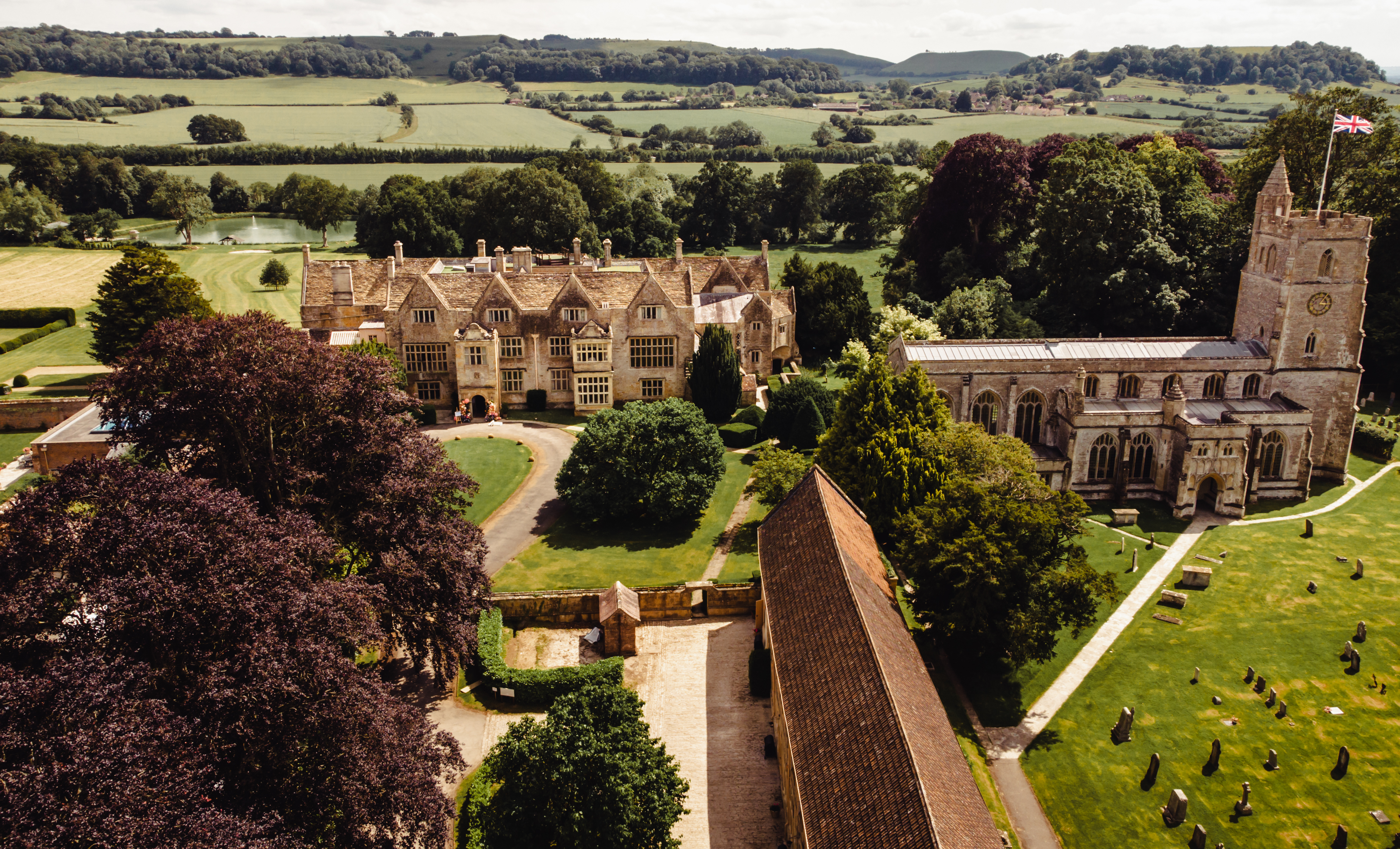 Grade I listed North Cadbury Court, the Montgomery family home, dominates its corner of the Somerset countryside. An exclusive-use choice sleeping 80, it has weighty elegance, a manor house facade and historic ceremony spaces like the North Hall and light-filled Ballroom or sweeping lawn, but holds spirited playfulness you rarely find in the old world. The team, including a dedicated events manager, is in your corner to pull off an expansive wedding weekend that brings everyone together for afternoon tennis matches and long lakeside lunches at the Yacht Club. Here, you have choice: there are no set packages you must sign on to, no rigid scheduling, no curfews, and no suppliers written in stone, so you can roll out your fun into the early hours and bring in the caterer, florist, and photographer that feels most you (though remember, the Events Manager is on hand to advise). North Cadbury Court wants its weddings to be full of laughs and is accordingly decked out for maximum fun: rooftop golf, bumper balls, a secret casino, an underground disco. But this doesn’t come at the expense of tradition; the sandstone English chapel, St Michael’s Church, is just a few steps away.
